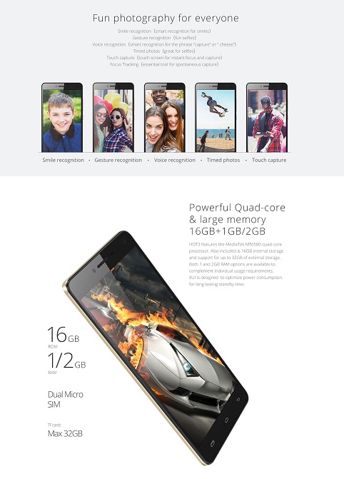 Infinix Hot 3 Lite X554 dilengkapi dengan processor MediaTek MT6580 Quad-Core. Juga dilengkapi dengan 16GB memori internal dan mendukung memori eksternal hingga 32GB. Selain itu dibekali dengan RAM 2 GB yang kuat untuk performa smartphone para sobat semua. XUI didesain untuk mengoptimisasi konsumsi tenaga sehingga dapat bertahan lebih lama.