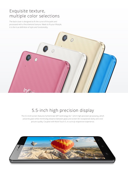 Bagian belakang smartphone ini didesain agar terasa pas ditangan dan juga diproses dengan tekstur berlian. Dibuat sesuai dengan gaya para sobat semua, definisi yang sesungguhnya dari gaya dan fungsionalitas. Dilengkapi dengan layar 5.5 inci yang menggunakan teknologi GFF Full-Laminate untuk prosesi 1.2mm High Precision sehingga meminimalisasi jarak antara gelas dan layar untuk kualitas gambar yang lebih baik. Dipasangkan dengan Multi-Touch 5, yang sangat responsif.