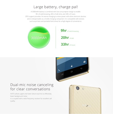 Infinix Hot 3 Lite X554 menggunakan silicon pada atas dan bawah dengan dual-mic agar menghilangkan suara-suara di sekitar secara efektif, lalu dipasangkan dengan receiver berfrekuensi lebar yang menghasilkan suara telepon yang jernih. Ini merupakan generasi kedua amplifier music yang menggunakan RNS nan unik dan teknologi noise cancelling dari Aiwei untuk membatasi suara TDD. Teknologi Anti-sound break juga diimplementasi untuk kualitas suara yang indah.