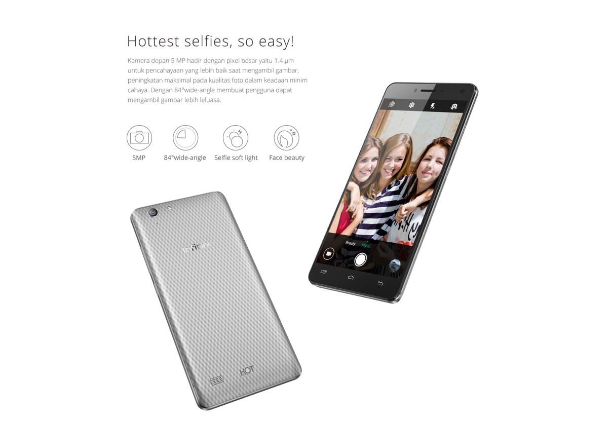 Pada kamera depan smartphone ini dibekali kamera 5MP dengan 84°wide-angle, selfie soft light, Face beauty.