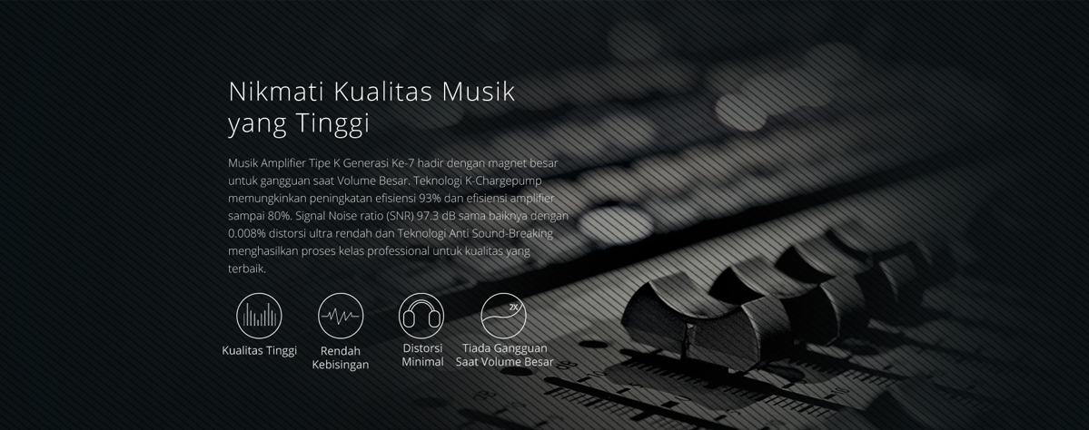 - Musik Amplifier Tipe K Generasi Ke-7 hadir dengan magnet besar untuk gangguan saat Volume Besar. Teknologi K-Chargepump memungkinkan peningkatan efisiensi 93% dan efisiensi amplifier sampai 80%. Signal Noise ratio (SNR) 97.3 dB sama baiknya dengan 0.008% distorsi ultra rendah dan Teknologi Anti Sound-Breaking menghasilkan proses kelas professional untuk kualitas yang terbaik.